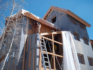 We've still be applying foam to the house, waiting, as per usual, for a dry spell with warm temperatures. Tuesday I put the foam on this crazy triangle wall above the greenhouse and put my 3-dimensional geometry skills to the test.